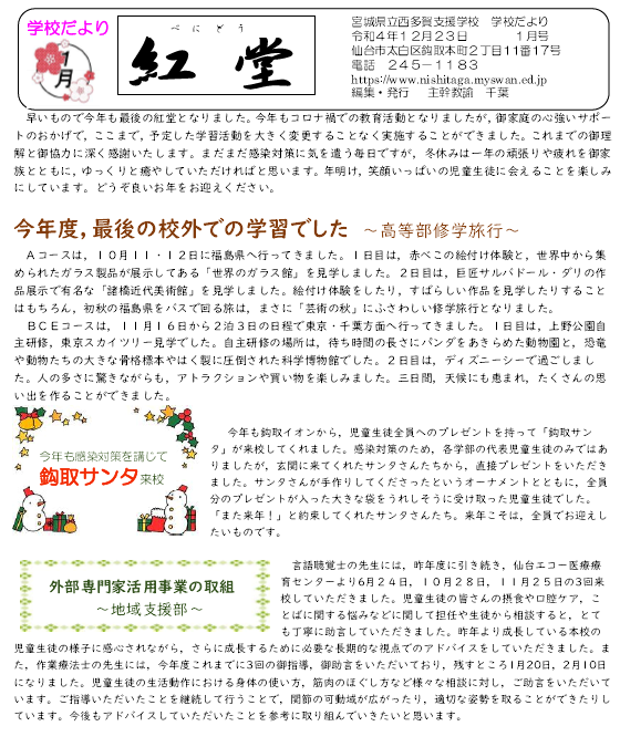 ホーム学校紹介 学校の特徴教育目標児童生徒数・職員数教育課程と学級名学校評価学校行事校章・校歌・校木学校沿革小学部 小学部の紹介new行事紹介(1学期)行事紹介(2学期)中学部 中学部の紹介高等部 高等部の紹介高等部入学者選考(知的障害)高等部入学者選考(病弱)教育相談(地域支援)文化祭進路について校内研究 おたより 学校だより「紅堂」保健だより北海道東北病連のホームページサイトマップ