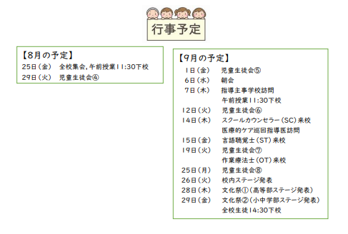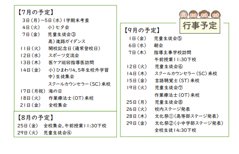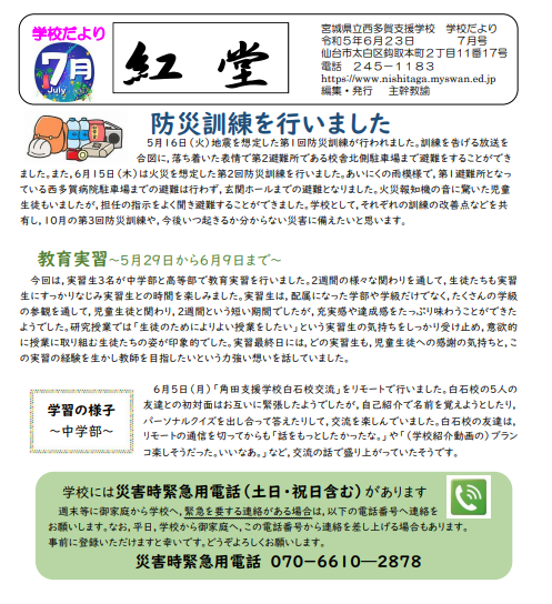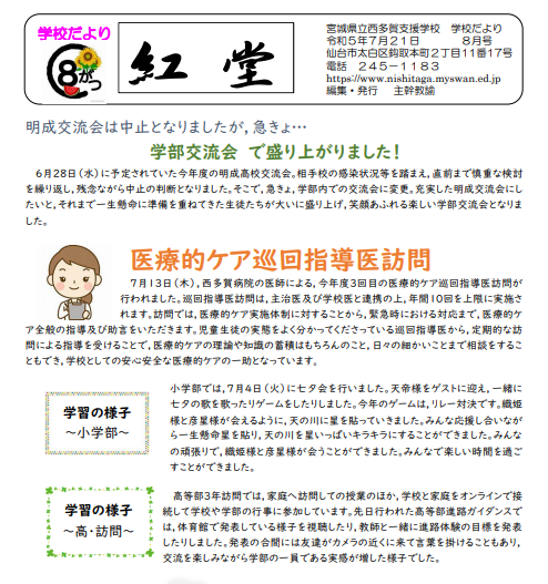 ホーム学校紹介 学校の特徴教育目標児童生徒数・職員数教育課程と学級名学校評価学校行事校章・校歌・校木学校沿革小学部 小学部の紹介new行事紹介(1学期)行事紹介(2学期)中学部 中学部の紹介高等部 高等部の紹介高等部入学者選考(知的障害)高等部入学者選考(病弱)教育相談(地域支援)文化祭進路について校内研究 おたより 学校だより「紅堂」保健だより北海道東北病連のホームページサイトマップ
