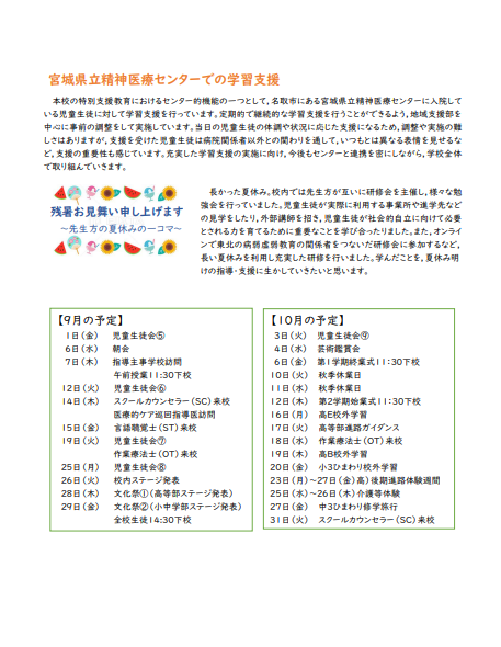 ホーム学校紹介 学校の特徴教育目標児童生徒数・職員数教育課程と学級名学校評価学校行事校章・校歌・校木学校沿革小学部 小学部の紹介new行事紹介(1学期)行事紹介(2学期)中学部 中学部の紹介高等部 高等部の紹介高等部入学者選考(知的障害)高等部入学者選考(病弱)教育相談(地域支援)文化祭進路について校内研究 おたより 学校だより「紅堂」保健だより北海道東北病連のホームページサイトマップ