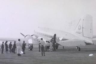 このとき麻田機長さんは、東京―札幌、東京―大阪しか飛ばなくなっていましたが、会社のはからいで特別に30人乗りの旅客機ダグラスDC-3型機を操縦して 仙台に飛来。