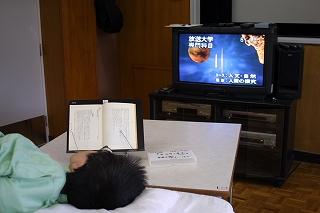 もちろん課題もあります。 今のところ単位認定試験は病院内で受験できますが、過去に放送された講義のビデオライブラリーを視聴したいときや、 卒業条件として必ず受講しなければならないことになっている面接授業を受けるときは、宮城学習センター(仙台市片平の東北大学構内)に出かける必要があり、本人及び保護者の負担が重いという点です。この点を克服し、将来は病院でも面接授業が受けられるようにしたいものです。【写真:放送大学の講義(ビデオ)を見ているところです(2004年度高等部3年生)】