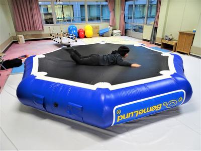 | トランポリン モデルは身長155㎝です。ビニル製のため,表面は滑りやすく,支援者は裸足での活動をおすすめします。一般的なゴムベルト製のような激しい弾みはありません。揺れ遊び程度の活動に最適です。 |