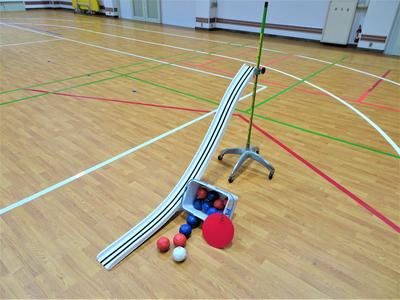 そのために,市販の教材を活用しつつ,必要に応じて個々の体の状況に応じたハンドメイドの教材をプラスし,少ない支援でスポーツに取り組むことが出来るような工夫をしています。ここに紹介するのはそういった教材です。短期間であれば貸し出し,あるいは製作のお手伝いが出来ますので,ご相談ください。