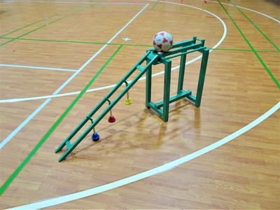 | ボッチャ 公認ボールが2セット。傾斜台が4つ,傾斜台の高さと角度を調整する支柱が4つあります。支柱は無段階に調節可能でキャスターが付いているので移動も楽です。ただし,支柱は手作り品のため上からあまり大きな負荷は掛けられません。 |